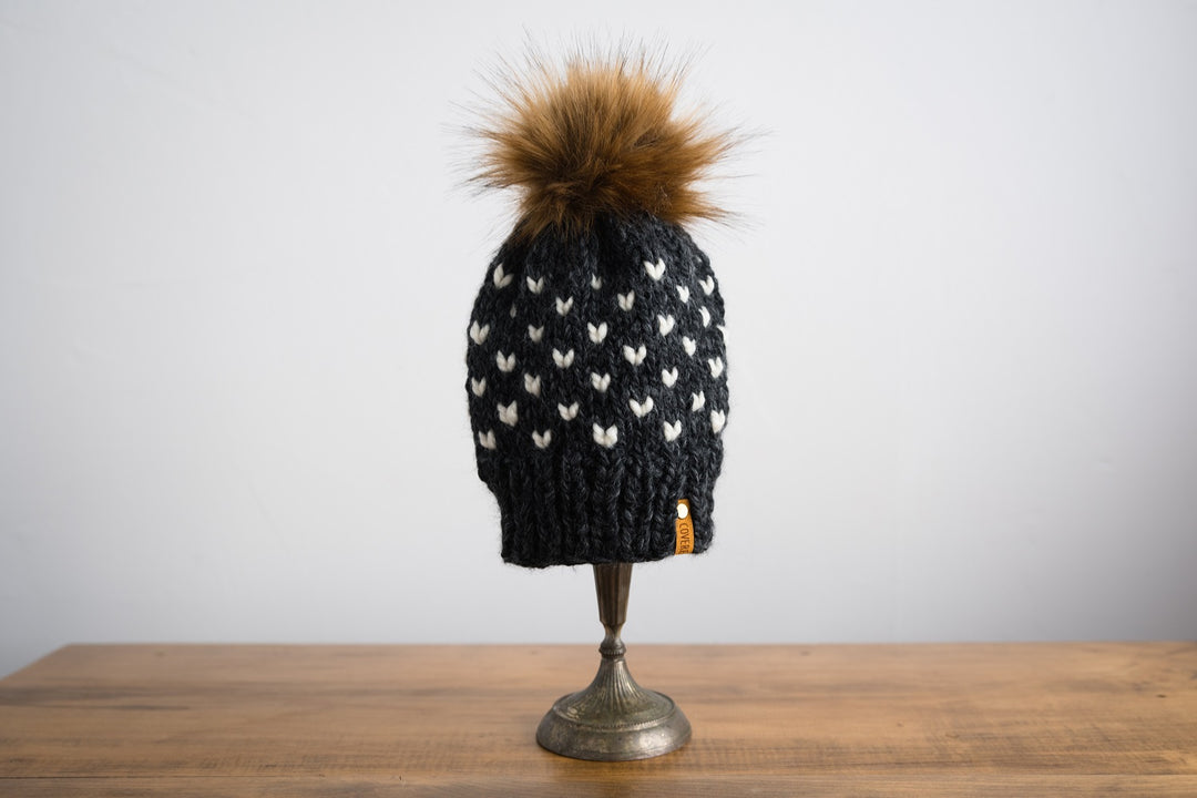 Our top selling hat has a little heart design in a contrasting color to give you a timeless style